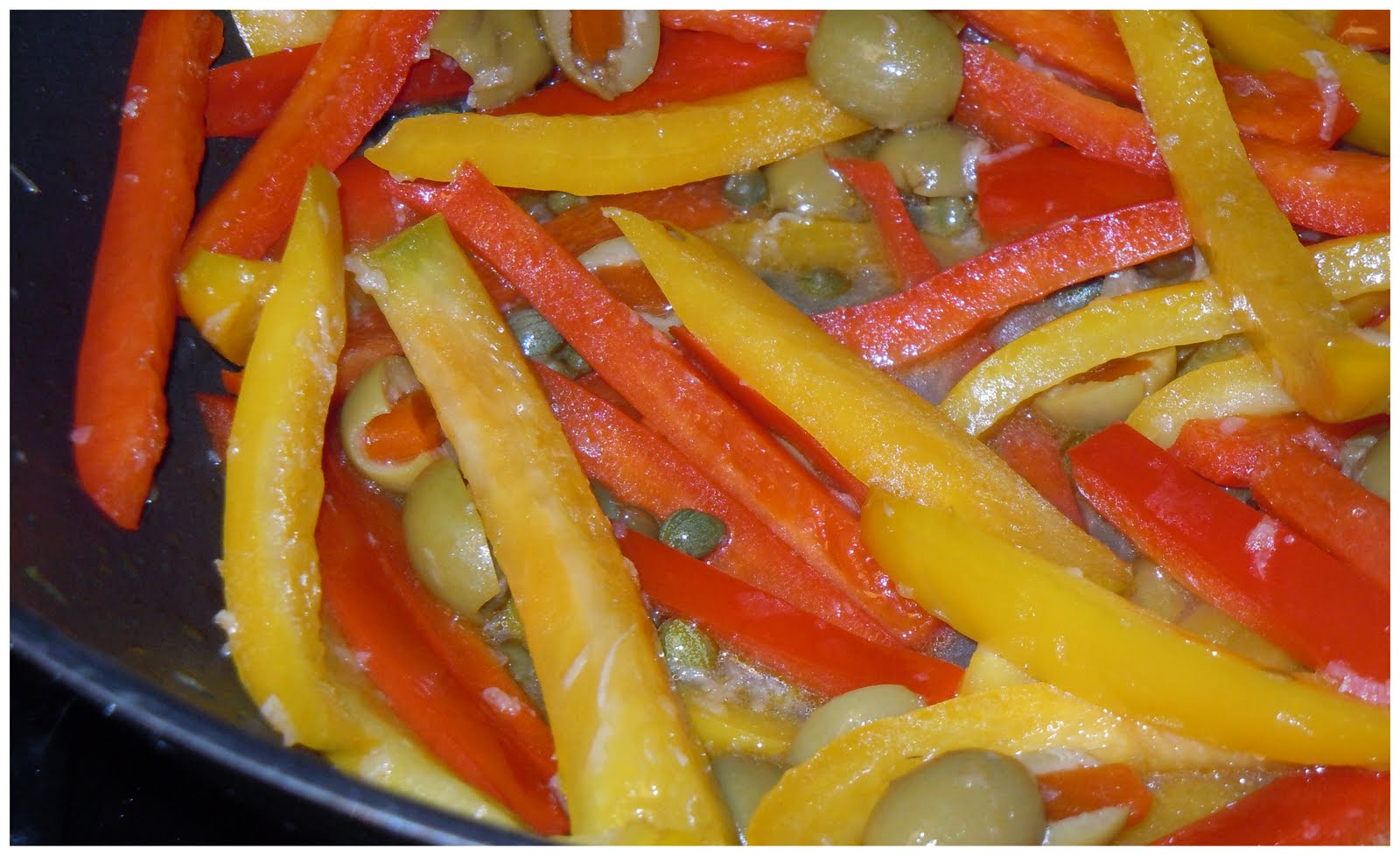 Over medium heat, combine the olive oil, garlic and peppers. Once they've softened up, add the red wine vinegar, olives, capers and orange zest. It doesn't really matter how long they cook. The longer they stay on the heat, the more enhanced the flavors will turn out. After the peppers softened, I turned the heat to low and left them on for about 30 minutes while I prepped and cooked the chicken.